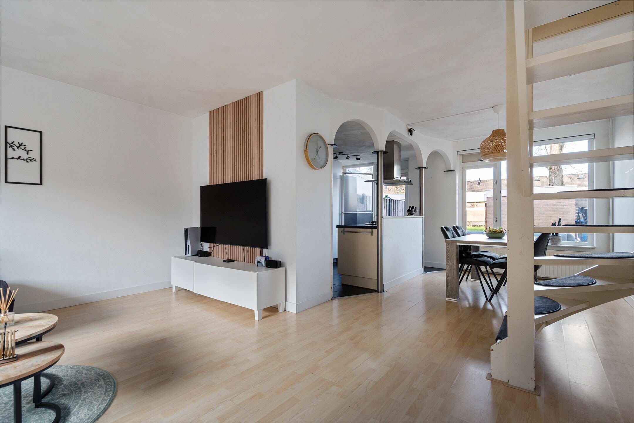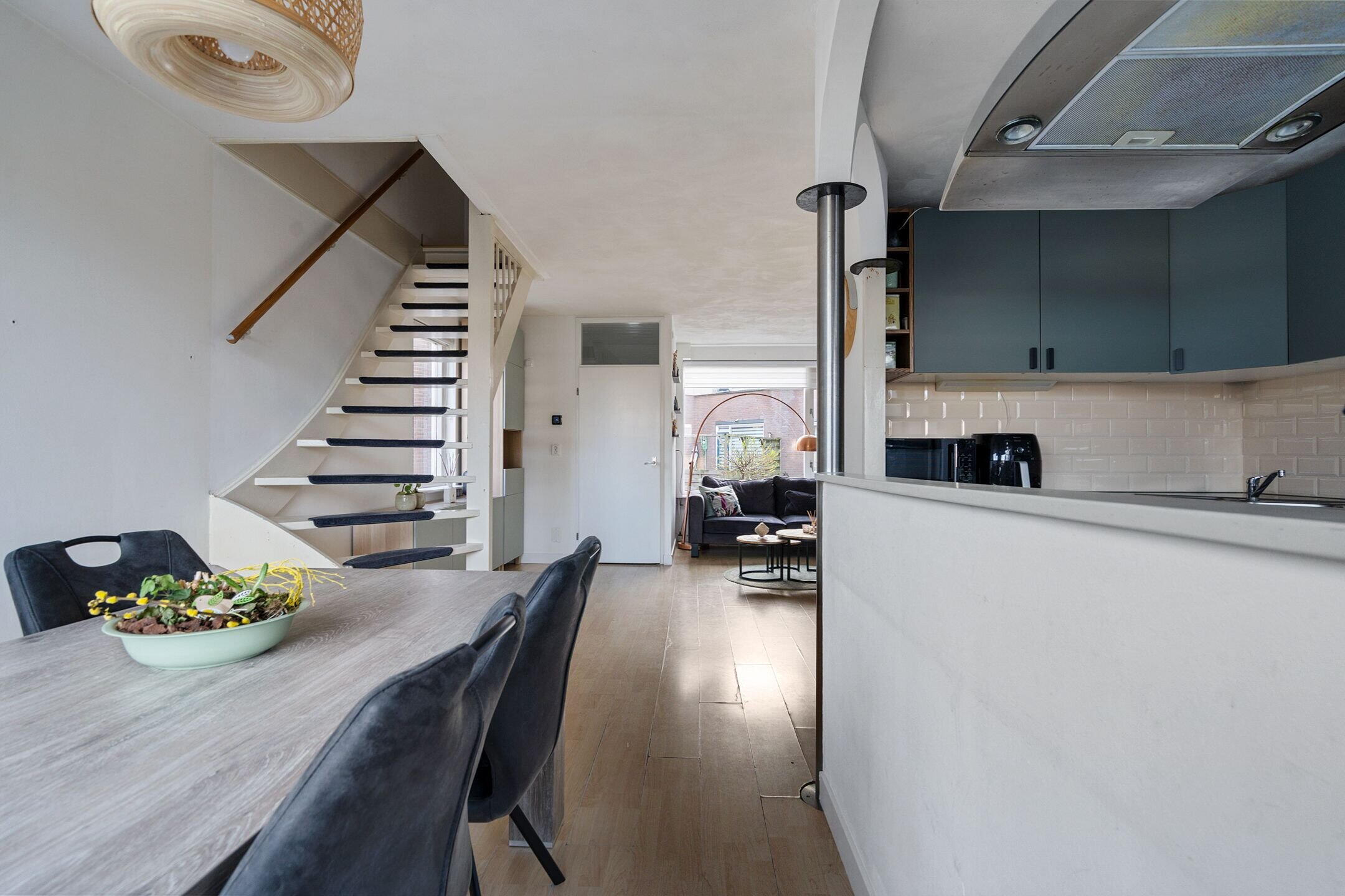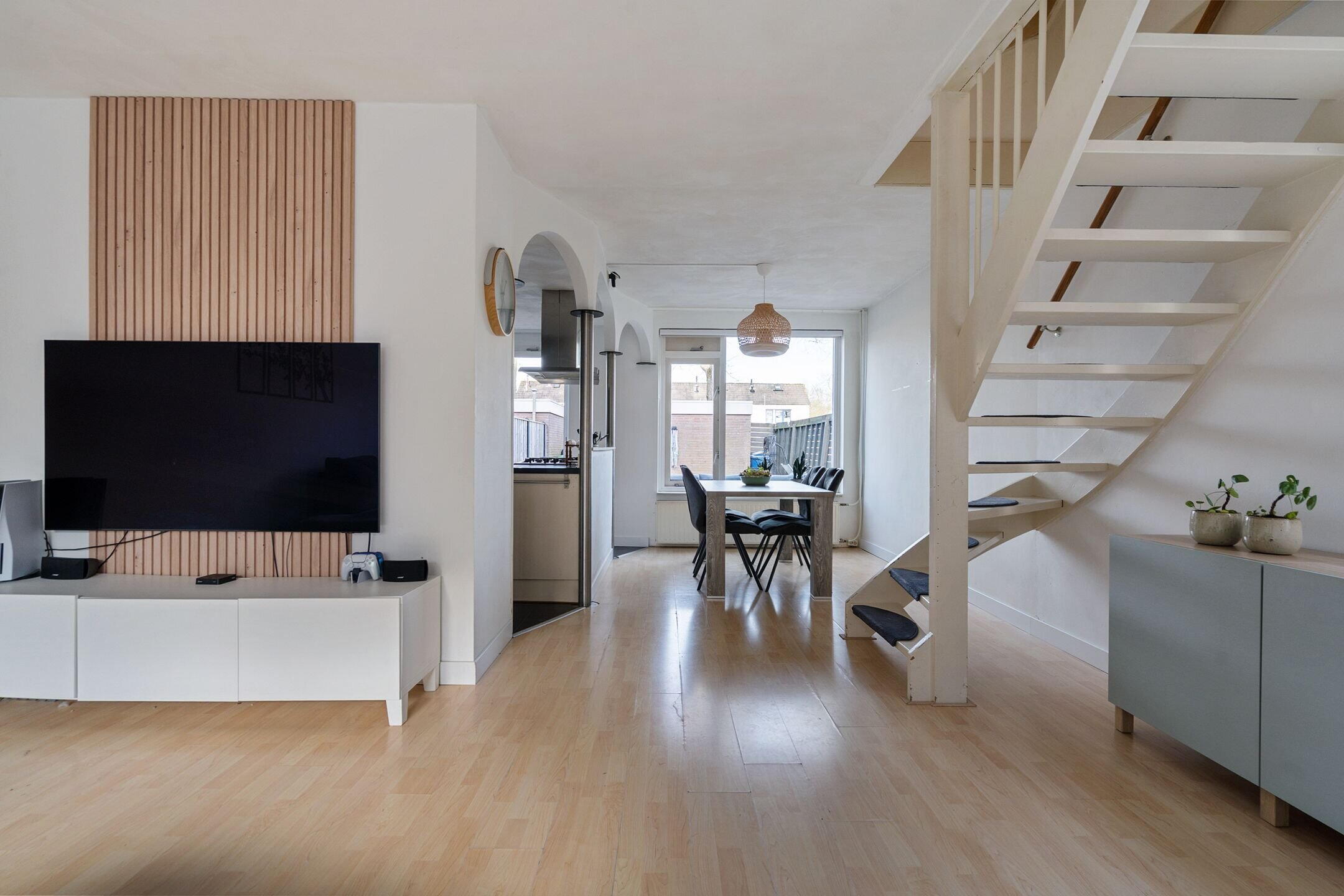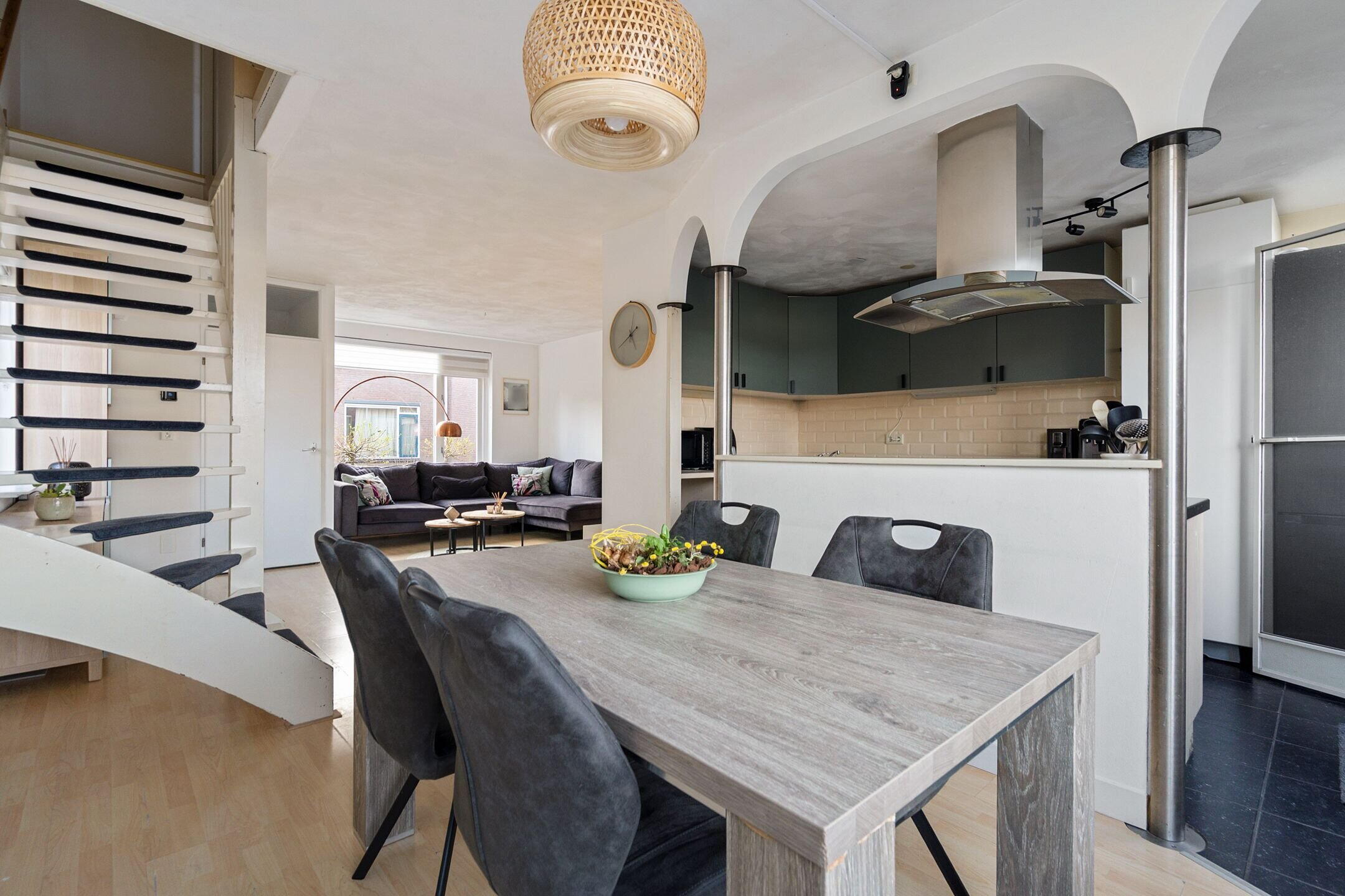 Bij binnenkomst word je direct verwelkomd in een lichte en verzorgde leefruimte. De woonkamer is ruim opgezet en biedt dankzij de grote raampartijen een prettige hoeveelheid daglicht. Aan de achterzijde bevindt zich een lichte keuken en een fijne plek vormt voor kookliefhebbers. De praktische indeling zorgt voor een mooie balans tussen koken, tafelen en ontspannen.