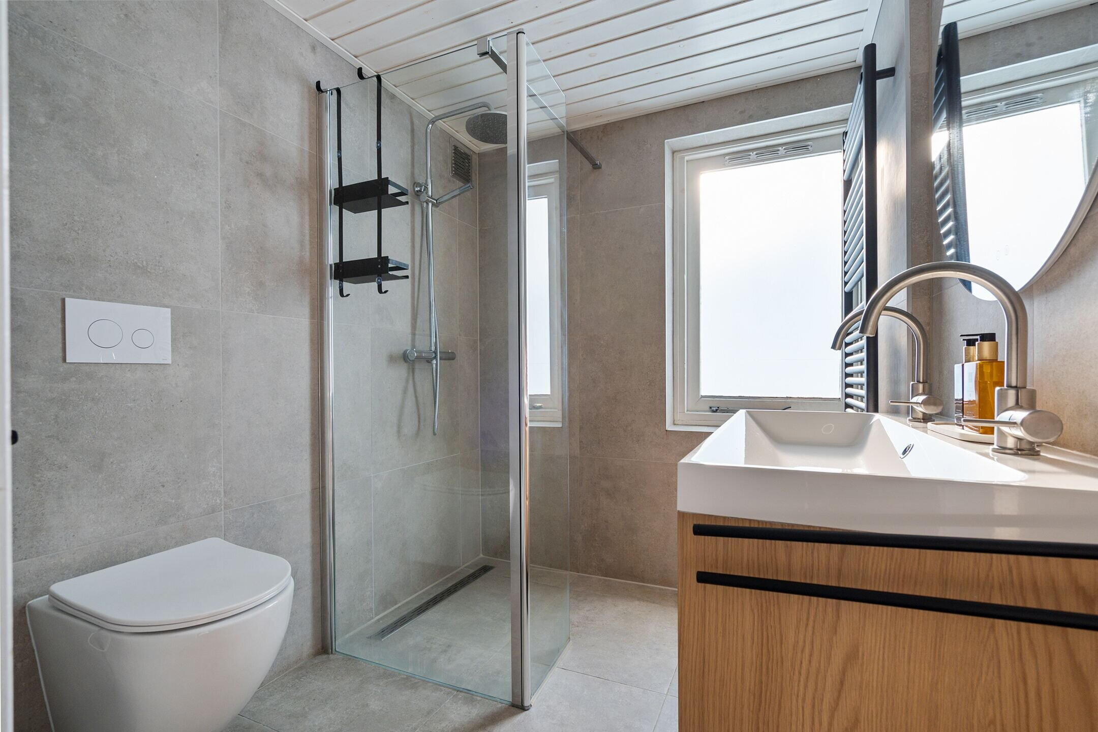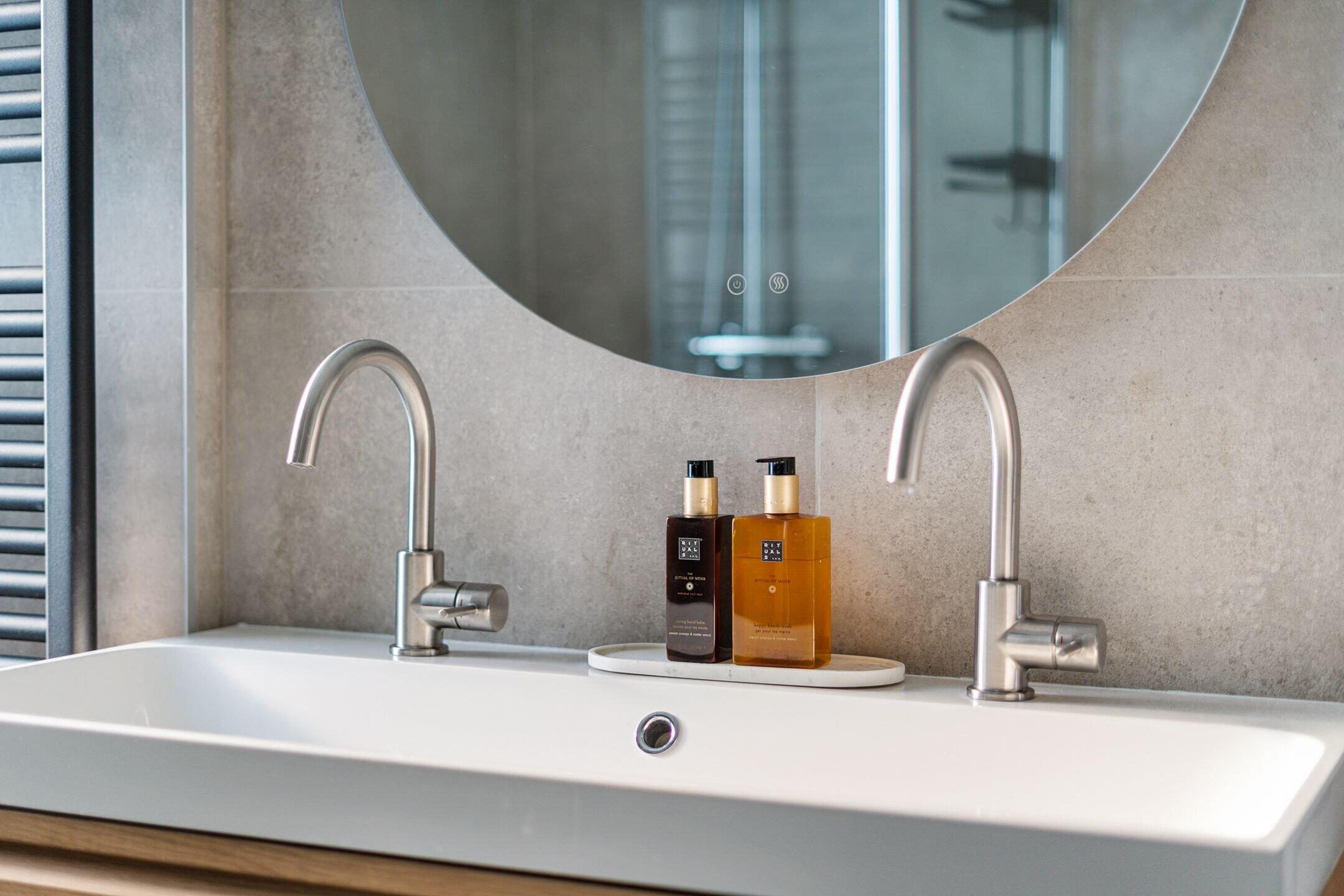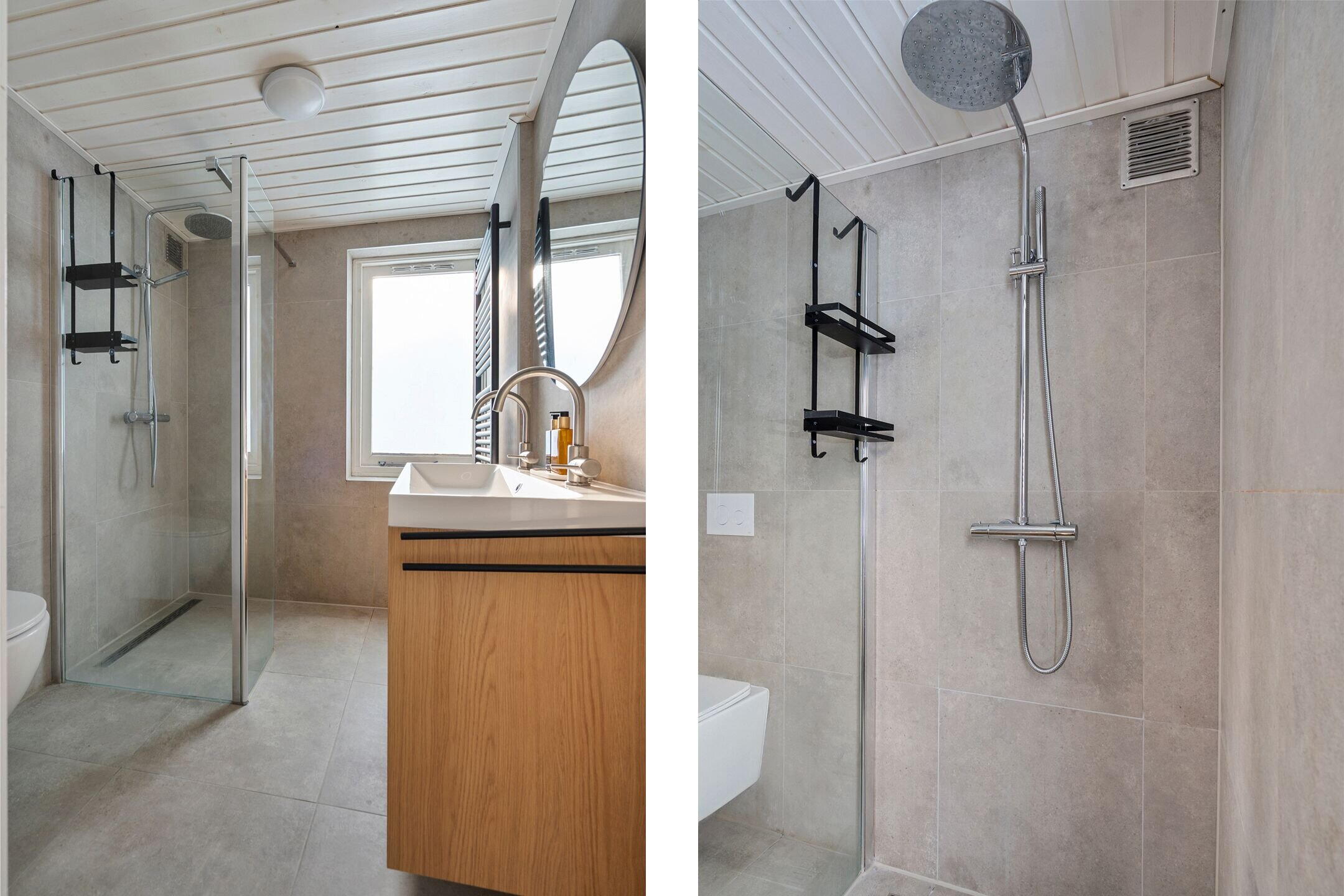- Douche, dubbele wastafel, en toilet